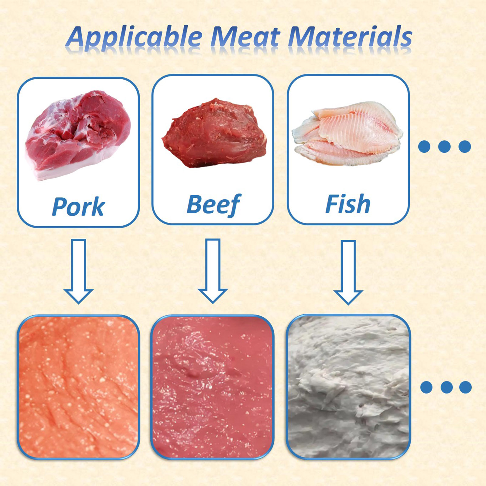 kinds of meat, such as pork, beef, fish and chicken to form meat puree