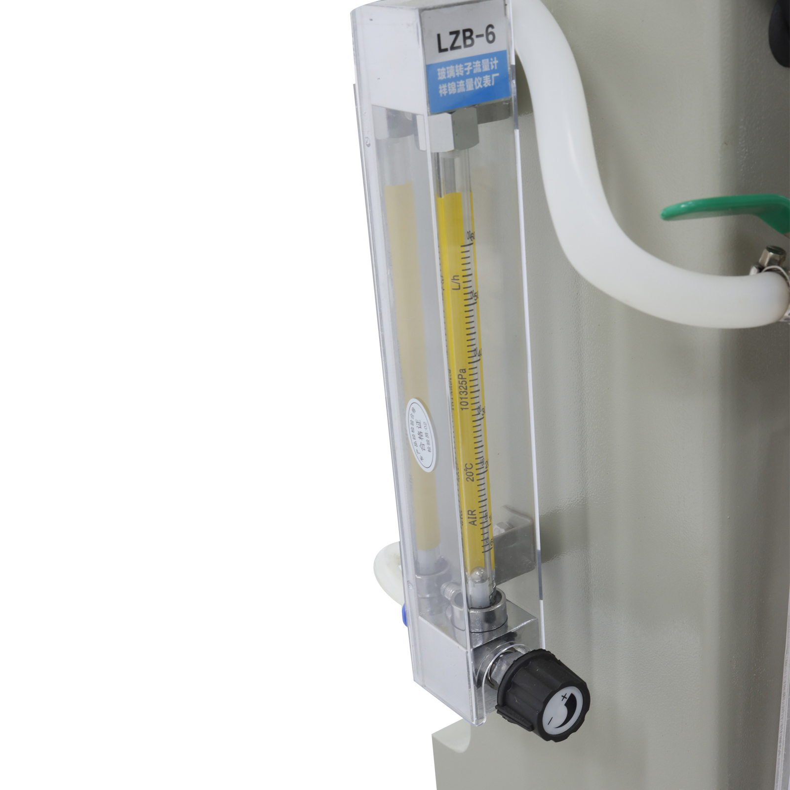 Glass rotameter for gas/air flow meter with control valve.